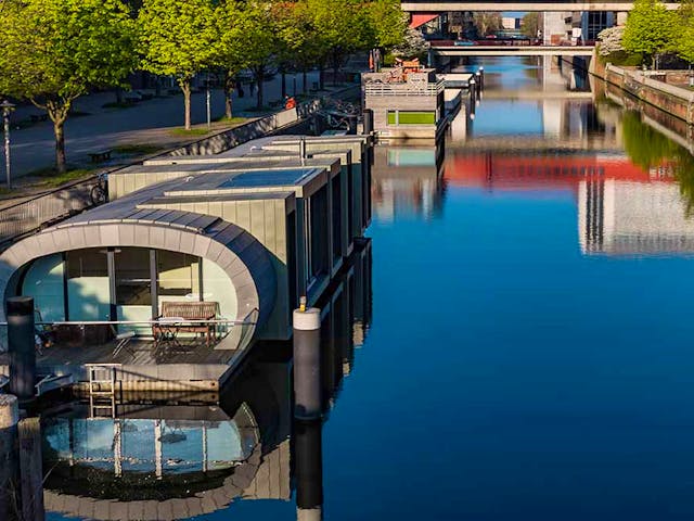 Fest vor Anker statt auf freiem Gewässer: Fürs dauerhafte Wohnen kommen Hausboote ohne eigenen Antrieb infrage. Die schwimmenden Häuser sind meist auf einem Ponton verankert. Dafür ist ein fester Liegeplatz erforderlich, der wie ein Grundstück erschlossen werden muss.